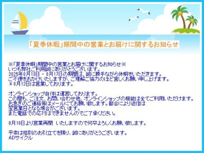 ※「夏季休暇」期間中の営業とお届けに関するお知らせ※